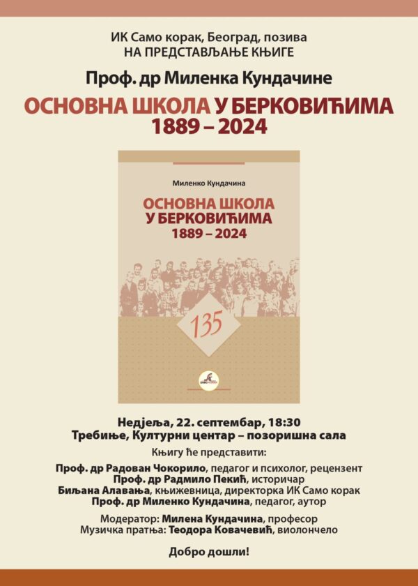 22.09.2024.ТРЕБИЊСКОЈ ПУБЛИЦИ ПРЕДСТАВЉЕНА КЊИГА „ОСНОВНА ШКОЛА У БЕРКОВИЋИМА 1889 – 2024“Монографска студија „Основна школа у Берковићима 1889–2024” аутора др Миленка Кундачине, професора емеритуса, представљена је вечерас требињској публици у позоришној сали Културног центра. Поред аутора, о књизи су говорили: проф. др Радован Чокорило, рецензент књиге, проф. др Радмило Пекић, историчар и Биљана…