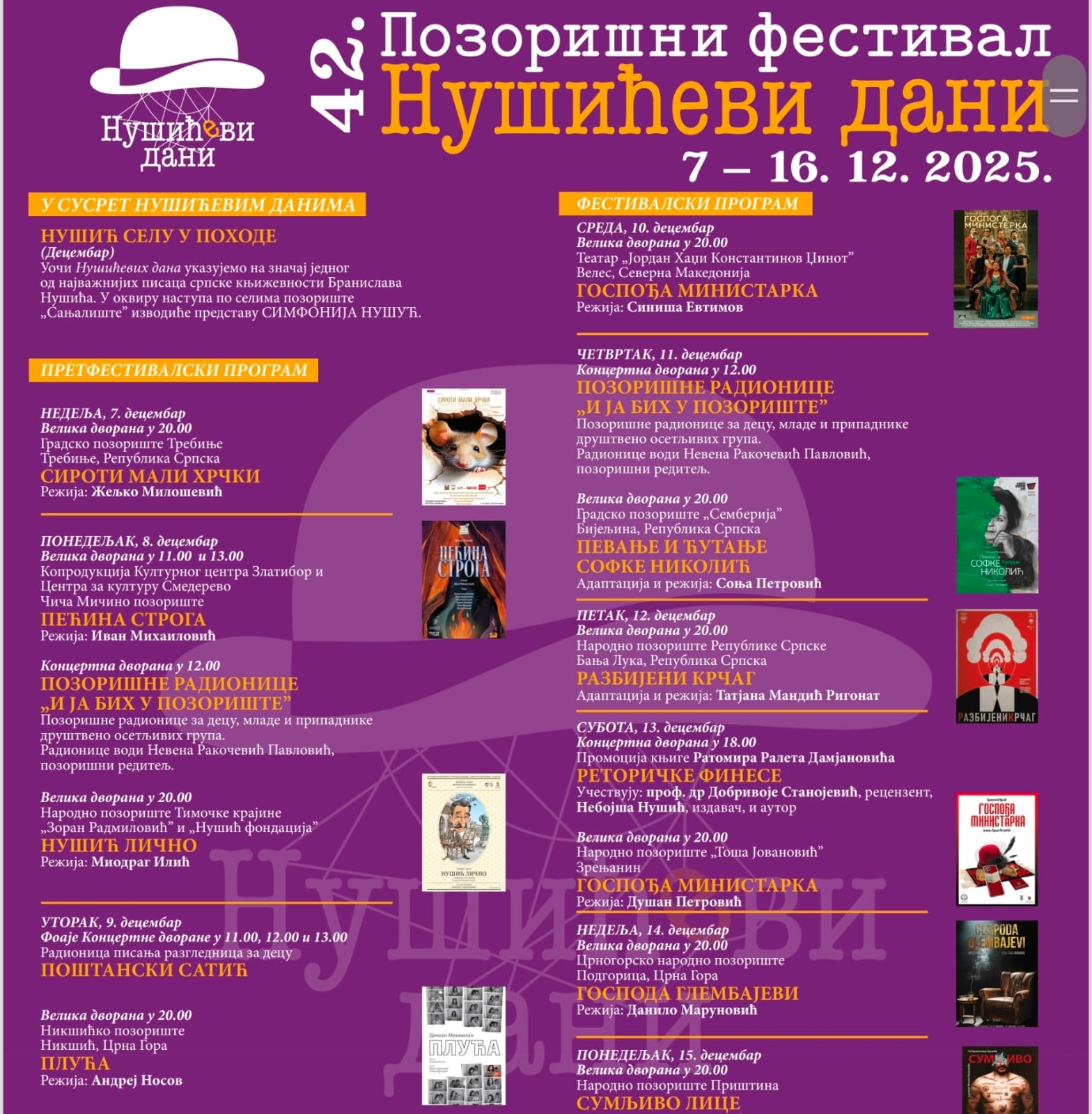 Градско позориште Требиње учествује са представом “Сироти мали хрчки” на позоришном фестивалу 42. Нушићеви дани, у Смедереву. Представа се игра у недељу, 7.12.2025. године у 20 часова у Центру за културу Смедерево.
