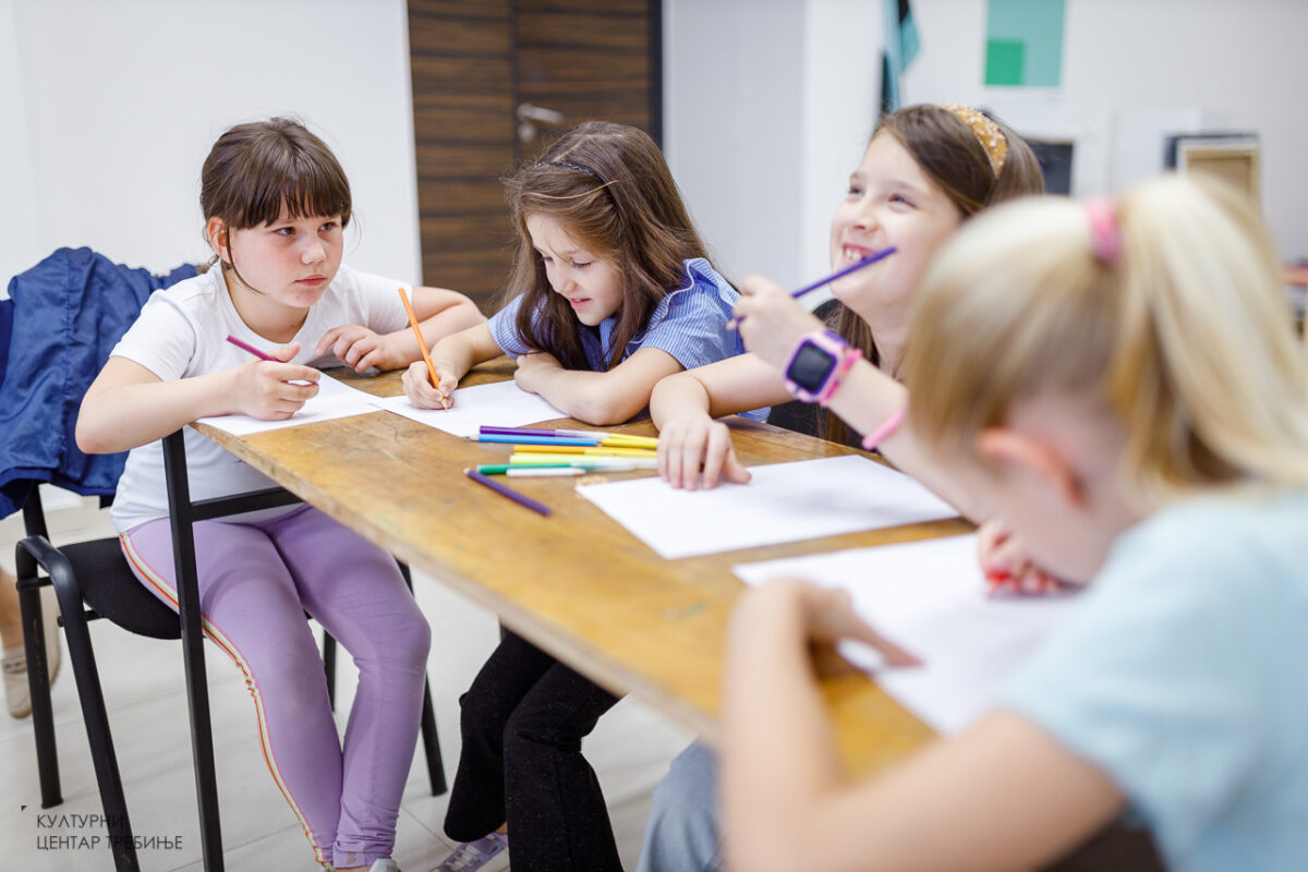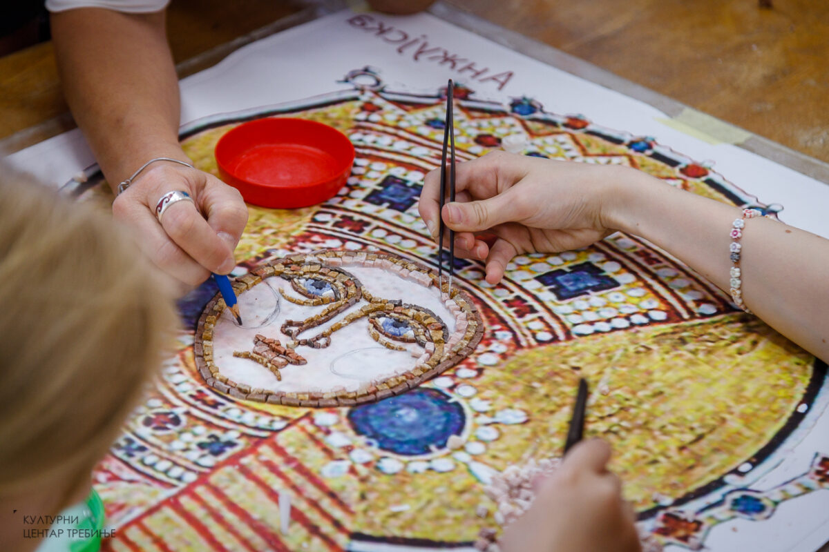 Радионица је окупила дјецу узраста од седам до четрнаест година, а требињски малишани упознаће се са материјалом – природним каменом и стакленом венецијанском пастом за мозаик, техником индиректног мозаика, обрадом камена, изливањем, окретањем и прањем мозаика.